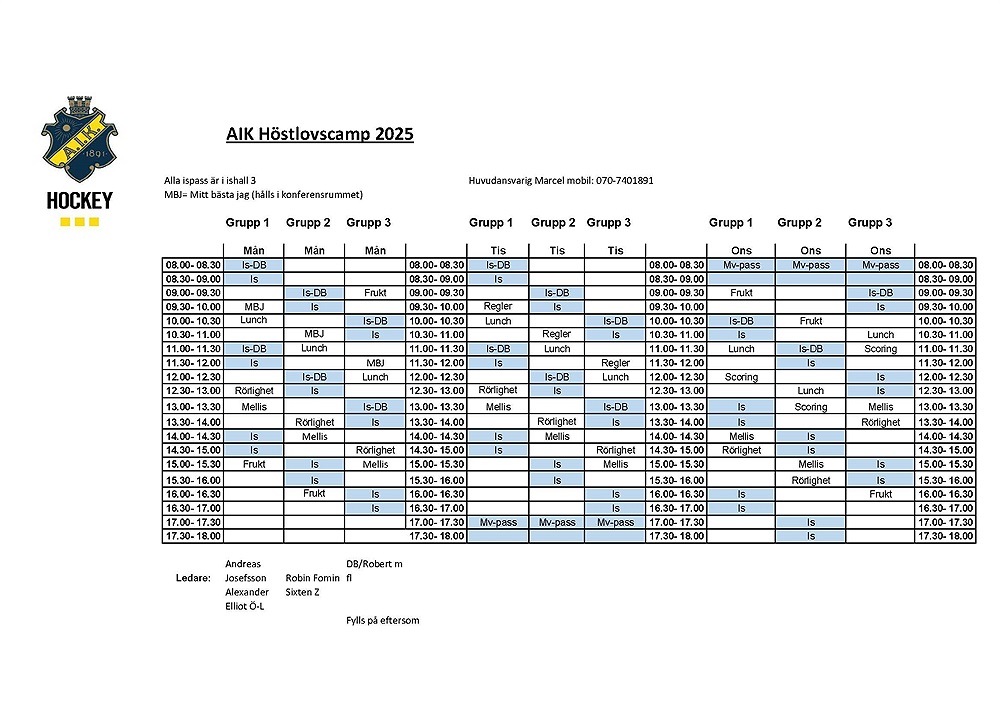 Daniel Broberg är huvudinstruktör, men vi har också många av våra AIK-tränare och juniorer med på isen, för fysen svarar Patrik Liljeblad. Teorin kommer vara en härlig mix av beteendekod (Marcel), regler (Robin) och målskytte (Robert), ett tema per dag.