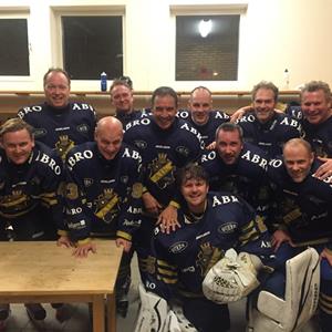 Älta skojade till det och ställde sig vid mittzon och hoppades att domarna skulle tro att det blev mål....och de trodde de :O Efter lite "ödmjukt" tillrättavisande till domarna att en puck måste vara inne i målet för att det skall bli mål så blev det nedsläpp i försvarszon och strax därefter var matchen slut. 5-3 till de mörkblåa , japp vi spelade i de fina jubileumströjorna denna afton.